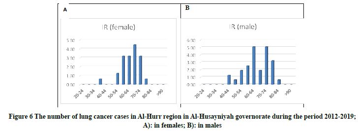 In Iraq, lung cancer is the second most common cancer and the most common among males. In the Basra-Iraq governorate, the number of injuries reached 746 (566 for males and 180 for females) during the period (2005-2012) and in Maysan governorate-Iraq, 119 cases (95 for males and 24 for females) were recorded during the period (2015- 2016) [4,15,18,19]. The number of cases in this study was small when compared with other governorates such as Basra and Maysan, because of the waste of wars in the south of Iraq as shown in Table 4.