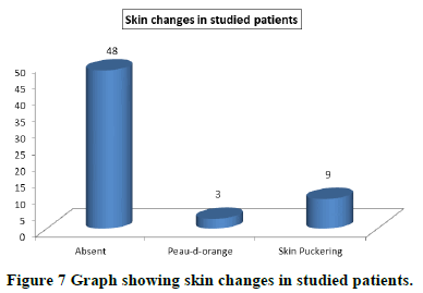 Skin changes were present in 20% patients. Most common skin change was skin puckering which was seen in 9 (15%) patients, peau-d-orange was present in 3 (5%) patients (Table 7 and Figure 7).