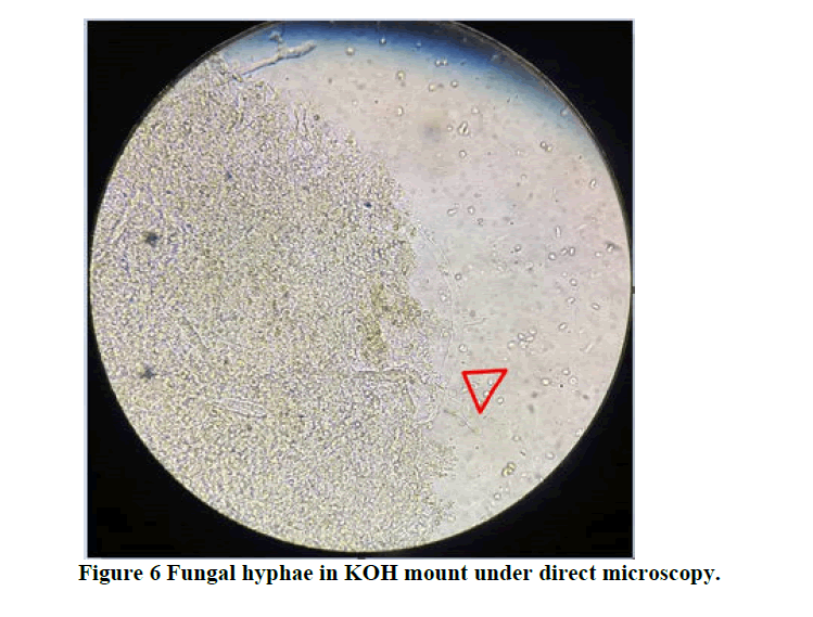 Microbiologic and histopathologic confirmation of fungal spores and hyphae is diagnostic of the type of fungus. If a potential diagnosis of CAM was made based on imaging, as per recommendations and guidelines a biopsy specimen was obtained by endoscopy. Direct microscopic evidence of fungal hyphae in Potassium Hydroxide (KOH) mounts was confirmatory of mucormycosis (Figure 5a,b,c).